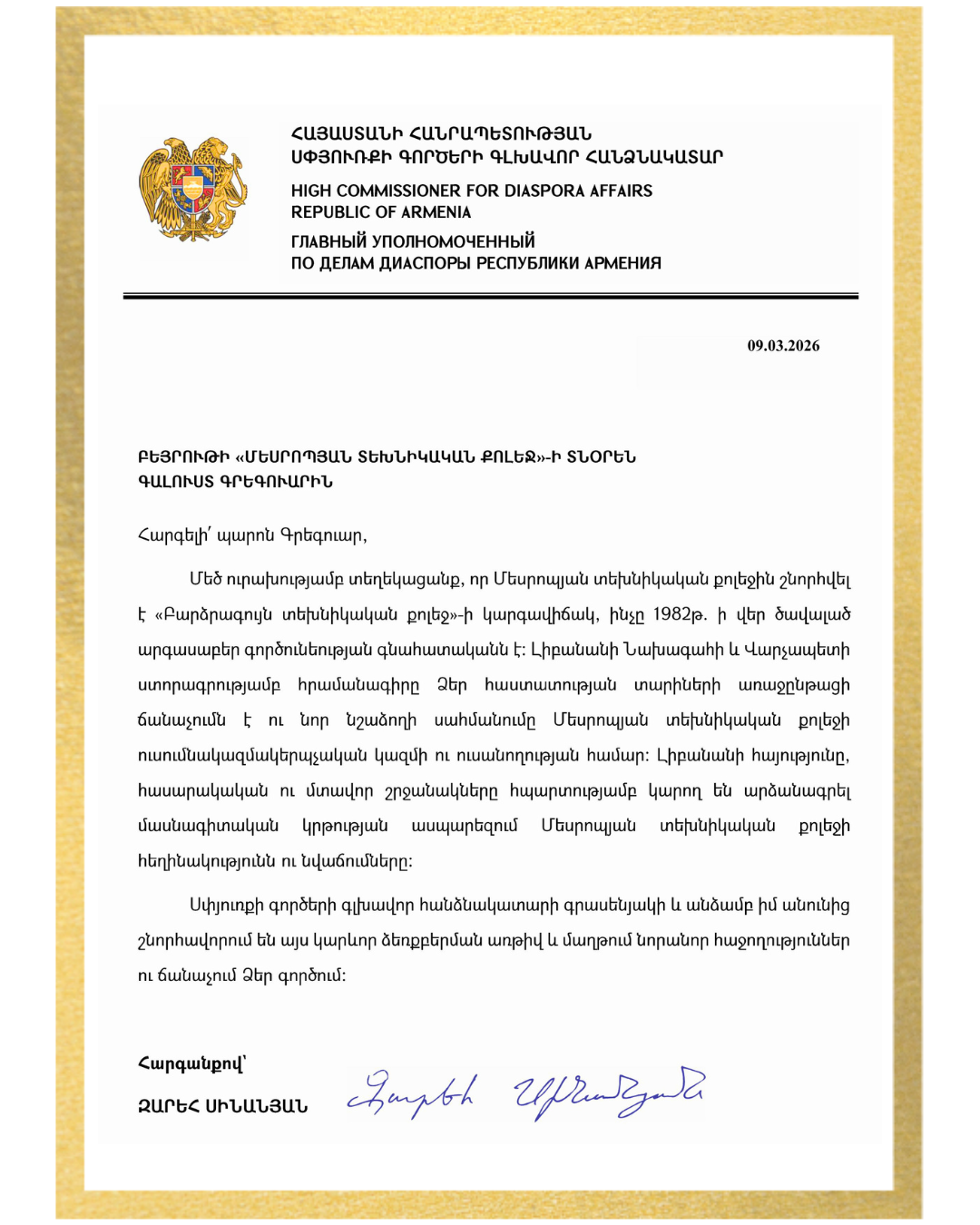 By Presidential Decree, Mesrobian Technical College Elevated to “Higher Technical College” Status